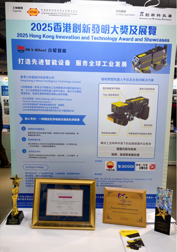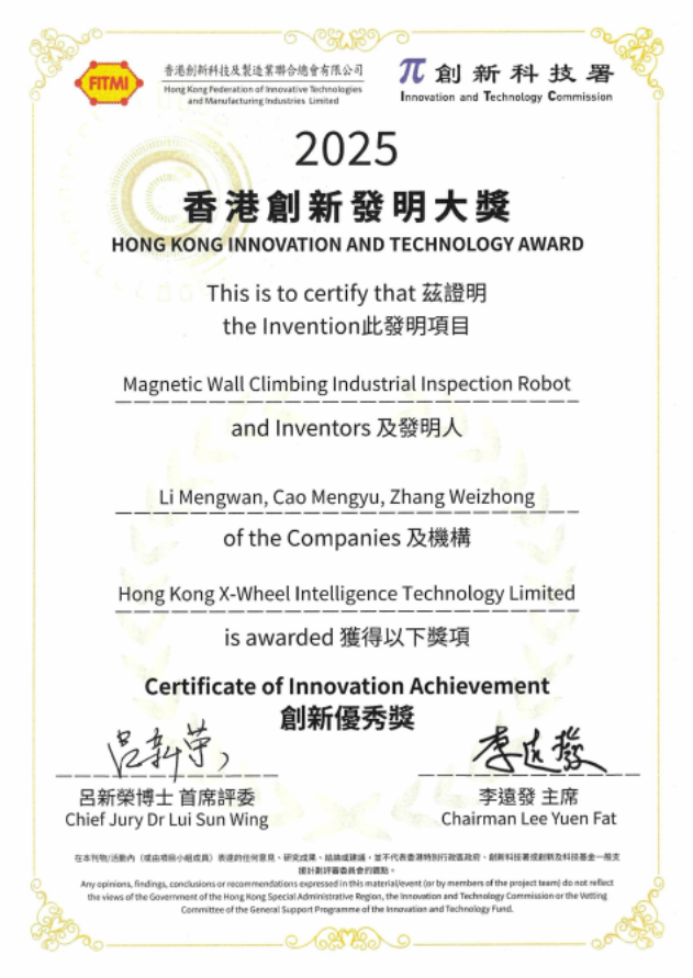 凭借其卓越的创新性和实用性,香港小轮智能科技有限公司的磁力攀爬机器人在众多参展项目中脱颖而出,荣获「创新发明优秀奖」。这一奖项不仅是对公司在技术创新方面所做努力的高度认可,也标志着香港小轮智能科技有限公司在推动行业技术进步方面迈出了重要的一步。